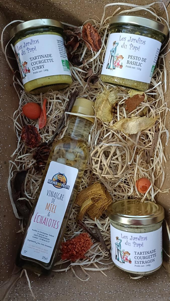 Ce panier de noël se compose d'une tartinade courgette curry, d'une de courgette estragon, d'un pesto basilic et d'un délicieux vinaigre miel Echalote. Il provient de notre partenaire du jardin le rucher qui picote (vinaigre non labellisé bio). Notre panier est entouré d'un beau panier cristal.