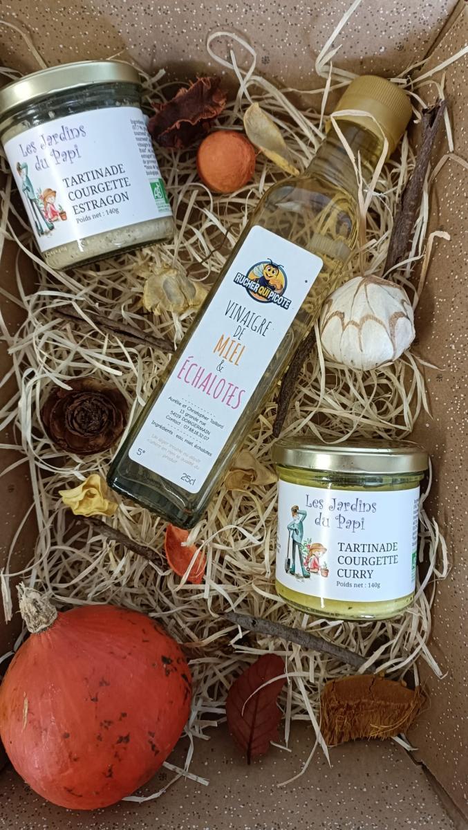Ce panier de noël se compose d'une tartinade courgette curry, d'une de courgette estragon et d'un délicieux vinaigre miel échalote. Il provient de notre partenaire du jardin le rucher qui picote (vinaigre non labellisé bio). Notre panier est entouré d'un beau panier cristal.