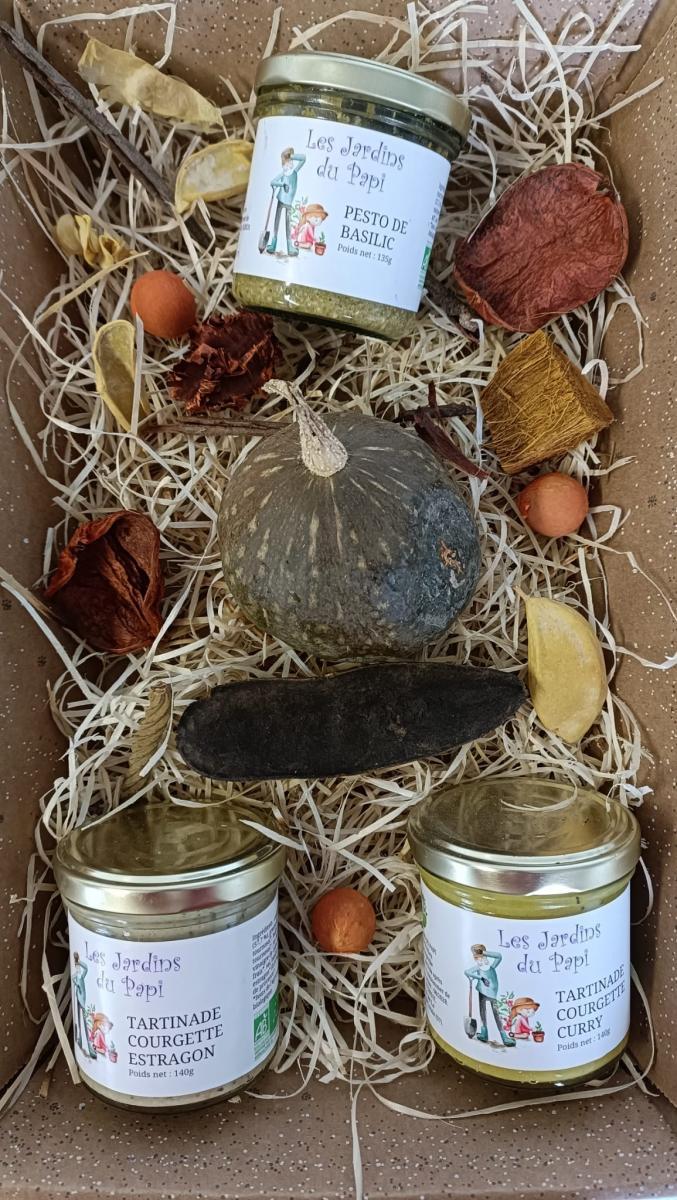 Notre panier de Noël se compose d'une tartinade courgette curry, d'une de courgette estragon et de notre produit phare, le pesto basilic. Le panier est entouré d'une jolie papier cristal.