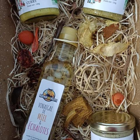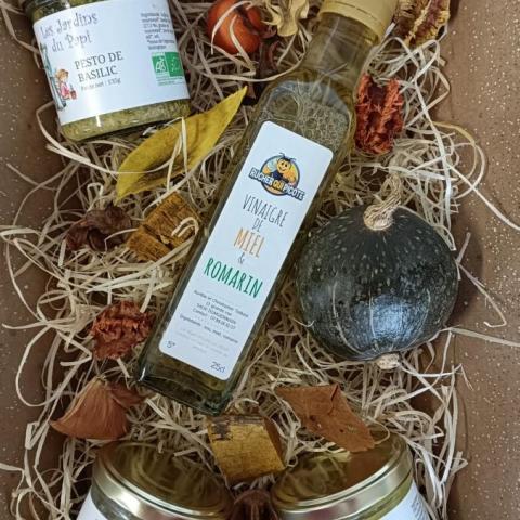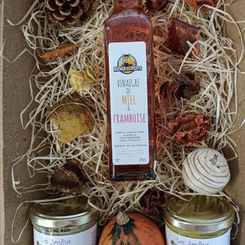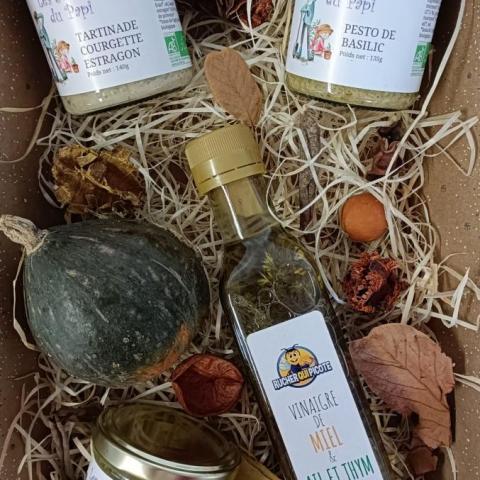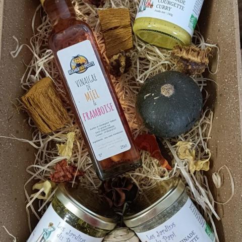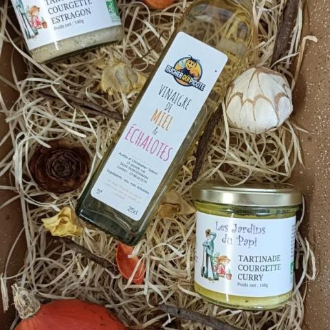 Ce panier de noël se compose d'une tartinade courgette curry, d'une de courgette estragon, d'un pesto basilic et une bouteille de vinaigre miel framboise. Ce délicieux vinaigre est fabriqué par notre partenaire le rucher qui picote (produit non labellisé bio).
