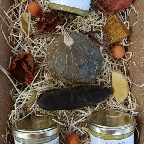 Notre panier de Noël se compose d'une tartinade courgette curry, d'une de courgette estragon et de notre produit phare, le pesto basilic. Le panier est entouré d'une jolie papier cristal.